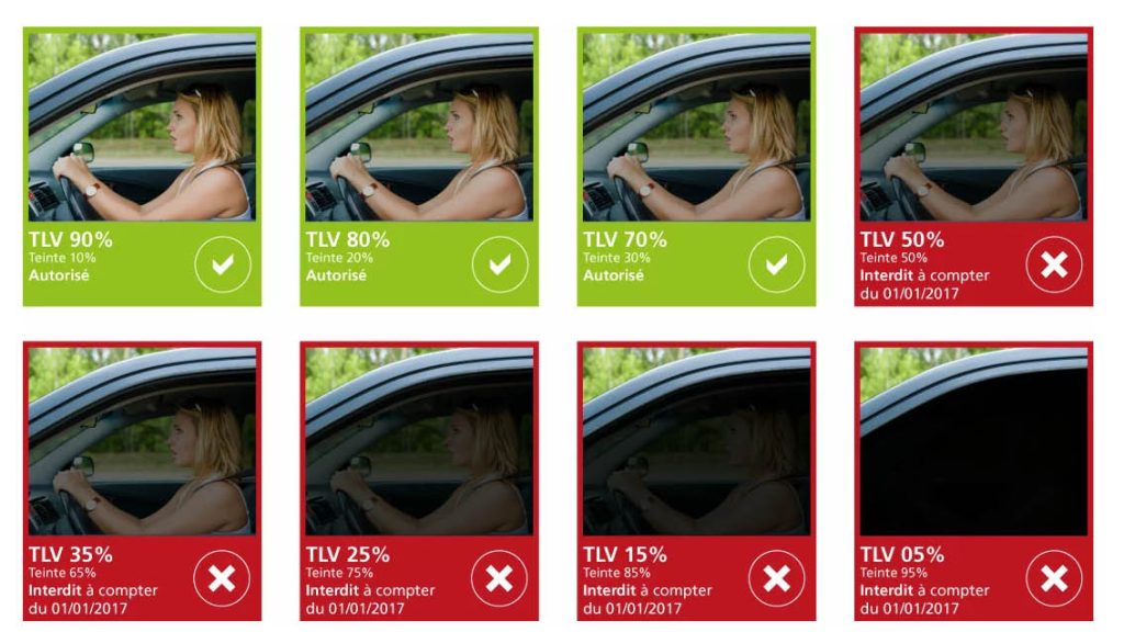 Les vitres avant (pare-brise et vitres latérales avant) doivent laisser passer au minimum 70 % de la lumière.